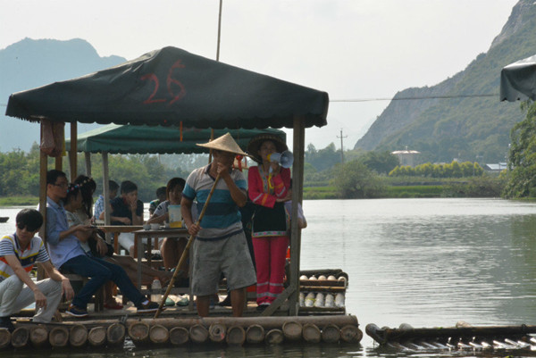 我們一行人乘坐幾條竹筏,逆流而上。隨行的還有一位壯族姑娘,扮演現(xiàn)代版的劉三姐與我們大家對(duì)歌。她歌如夜鶯,人若桃花,熱情好客,并且為我們解說(shuō)當(dāng)?shù)氐拿袼罪L(fēng)情。在對(duì)歌的過(guò)程中,壯族姑娘站在船頭向大家拋繡球,方佛我們又回到了當(dāng)年阿牛哥與劉三姐的世界。有些人從艄公手里接過(guò)長(zhǎng)蒿,向青草更清處漫溯。然而也有人在原地打轉(zhuǎn),還不停地碰撞他人竹筏。