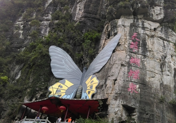 初聞蝴蝶泉時(shí),原以為會(huì)有許多蝴蝶可以看,然而去了之后除了看到石壁上有一只大大雕刻的蝴蝶外,再也沒(méi)有看到什么蝴蝶,還在想沒(méi)有蝴蝶叫什么蝴蝶泉,后來(lái)一想,現(xiàn)在都9月份,蝴蝶應(yīng)該都沒(méi)了。雖然沒(méi)有看到蝴蝶,但是這里還有一場(chǎng)盛大的表演,我們剛剛趕上。表演的時(shí)候需要邀請(qǐng)觀眾參加,道可視男兒當(dāng)仁不讓?zhuān)获R當(dāng)先,三個(gè)人沖下臺(tái)去,不過(guò)很快臉就被涂黑了——至于原因到現(xiàn)在也不是很懂。其實(shí)現(xiàn)場(chǎng)表演的是壯族小伙搶親節(jié)目,后來(lái)道可視的帥哥很艱難的搶到了一位壯族的阿妹。按照當(dāng)?shù)亓?xí)俗,搶親成功的小伙應(yīng)當(dāng)留下來(lái)做阿妹的上門(mén)女婿,可是道可視的男兒志在天下,致力于開(kāi)拓全國(guó)市場(chǎng)。于是很遺憾的選擇了離開(kāi)。