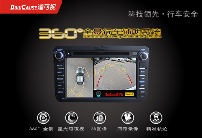 道可視360全景影像系統(tǒng)通過前后左右的四路攝像頭采集四周圖像,經(jīng)過無縫拼接后在原車屏實時形成360度全景俯視圖和前后左右的單視圖。車主可以清晰直觀的掌握周邊路況,不留一線視野盲區(qū),將一切盲區(qū)交通事故扼殺在發(fā)生之前。