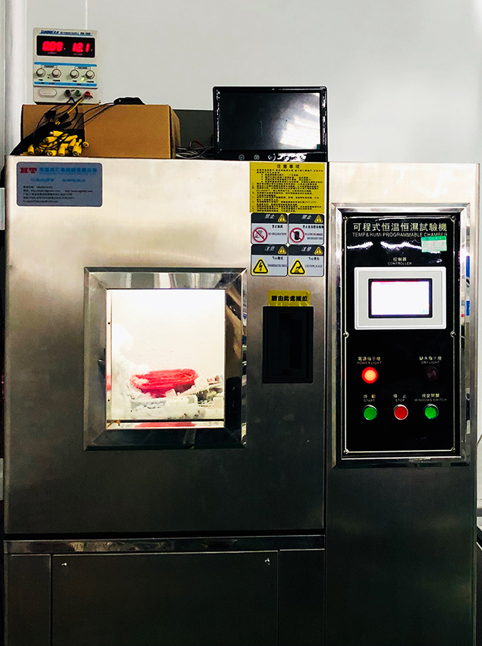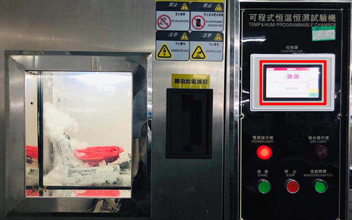 在道可視生產(chǎn)線(xiàn)眾多高科技的檢測(cè)工具中,不得不提可程式恒溫恒濕測(cè)試機(jī)。這臺(tái)機(jī)器24個(gè)小時(shí)全程處于開(kāi)機(jī)狀態(tài),可以對(duì)機(jī)器的高低溫和耐濕度進(jìn)行測(cè)試。在下圖中,道可視360°全景行車(chē)輔助系統(tǒng)的幾塊主板已經(jīng)放進(jìn)了機(jī)器進(jìn)行了幾天時(shí)間的測(cè)試,溫度設(shè)置在了﹣40℃,在如此惡劣的低溫條件下,測(cè)試機(jī)內(nèi)已經(jīng)結(jié)滿(mǎn)了冰霜,但道可視的主板卻依舊“頑強(qiáng)”的亮燈工作著。