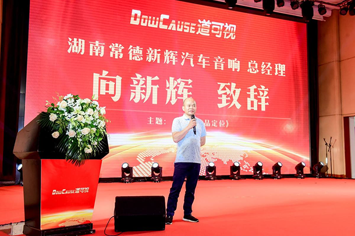 湖南常德新輝汽車音響總經(jīng)理向新輝上臺發(fā)言,他以自身多年門店運營經(jīng)驗,為嘉賓帶來“門店產(chǎn)品定位”的主題分享。